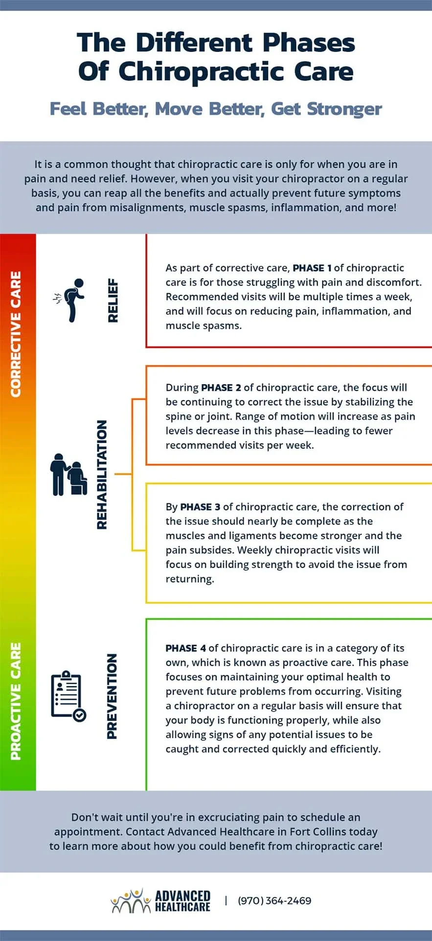 At our Fort Collins CO chiropractic clinic we use different types of chiropractic care to help treat your symptoms. Continue reading below or give our top-rated chiropractors a call today to learn more about how these phases could help you.